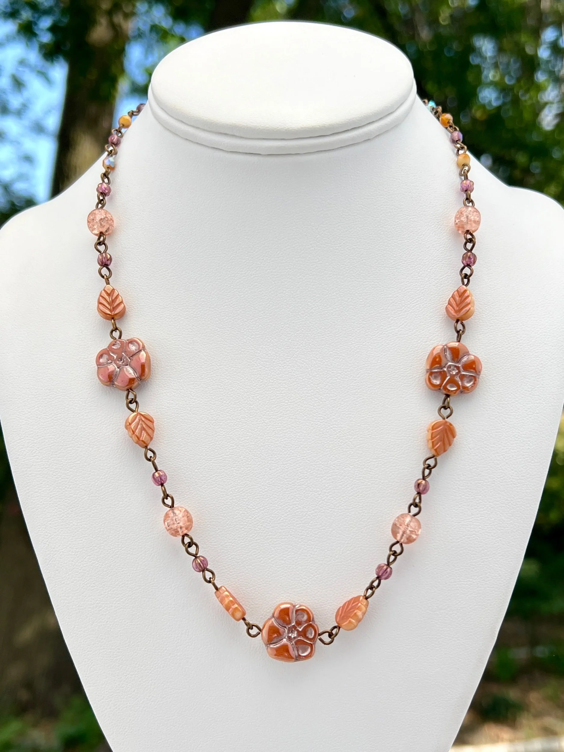 Warm amber and gold Czech glass beads mix with delicate leaf-shaped accents for a nature-inspired design. Hand-pressed in the Czech Republic for lasting beauty.