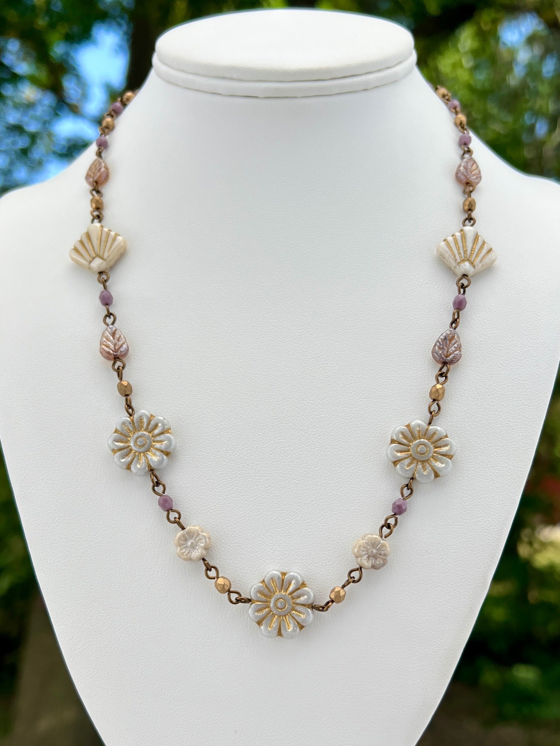 Elegant and understated, this ivory-toned Czech glass necklace features hand-pressed floral beads and shell-shaped accents. The neutral palette makes it a versatile piece for any wardrobe, while its traditional craftsmanship ensures lasting quality.