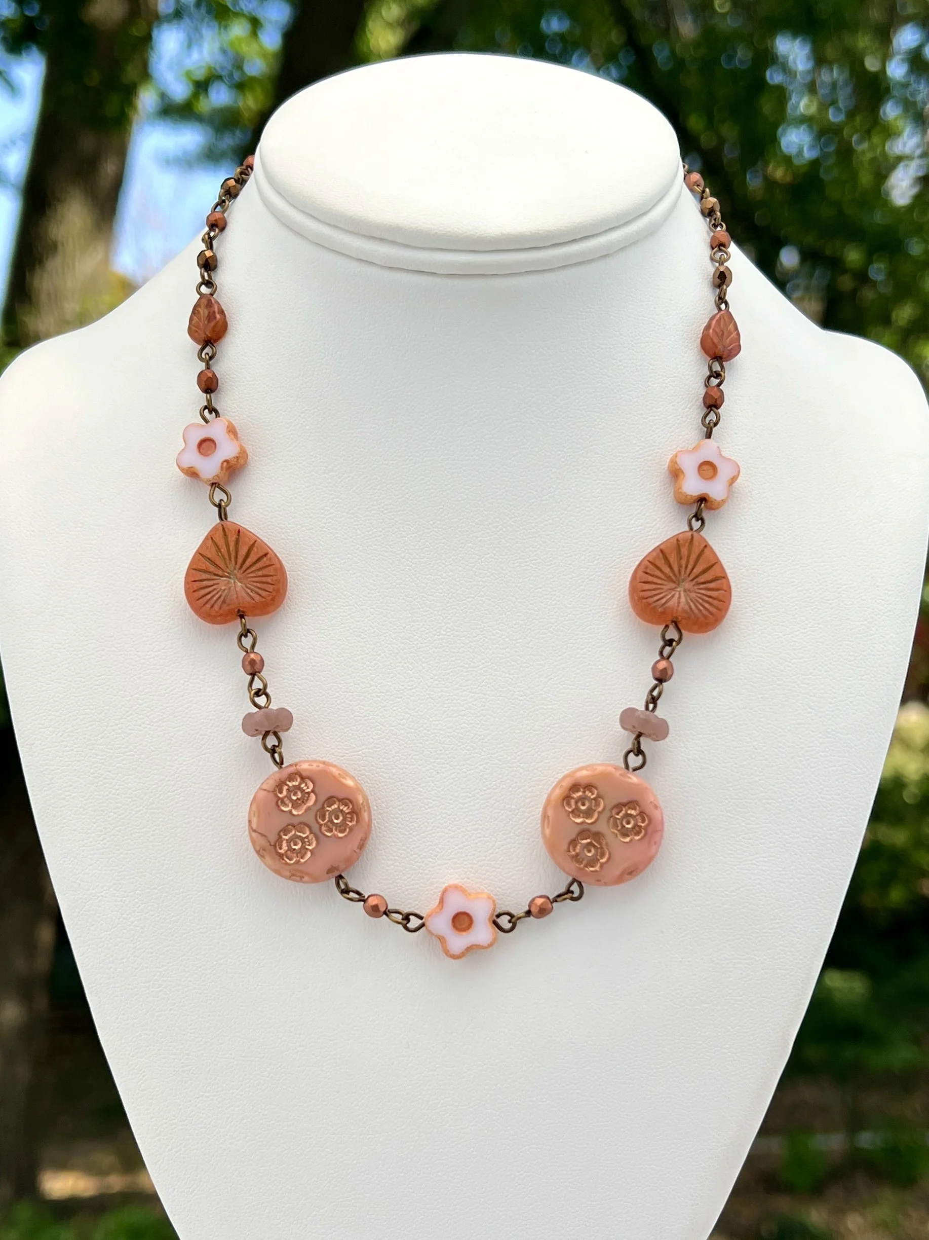 Featuring soft pink pressed glass flowers and shimmering gold accents, this necklace offers a warm, romantic feel. Each Czech glass bead is hand-pressed using traditional molds, giving it crisp detail and rich color. Lightweight and versatile, it pairs beautifully with both casual and dressy looks.